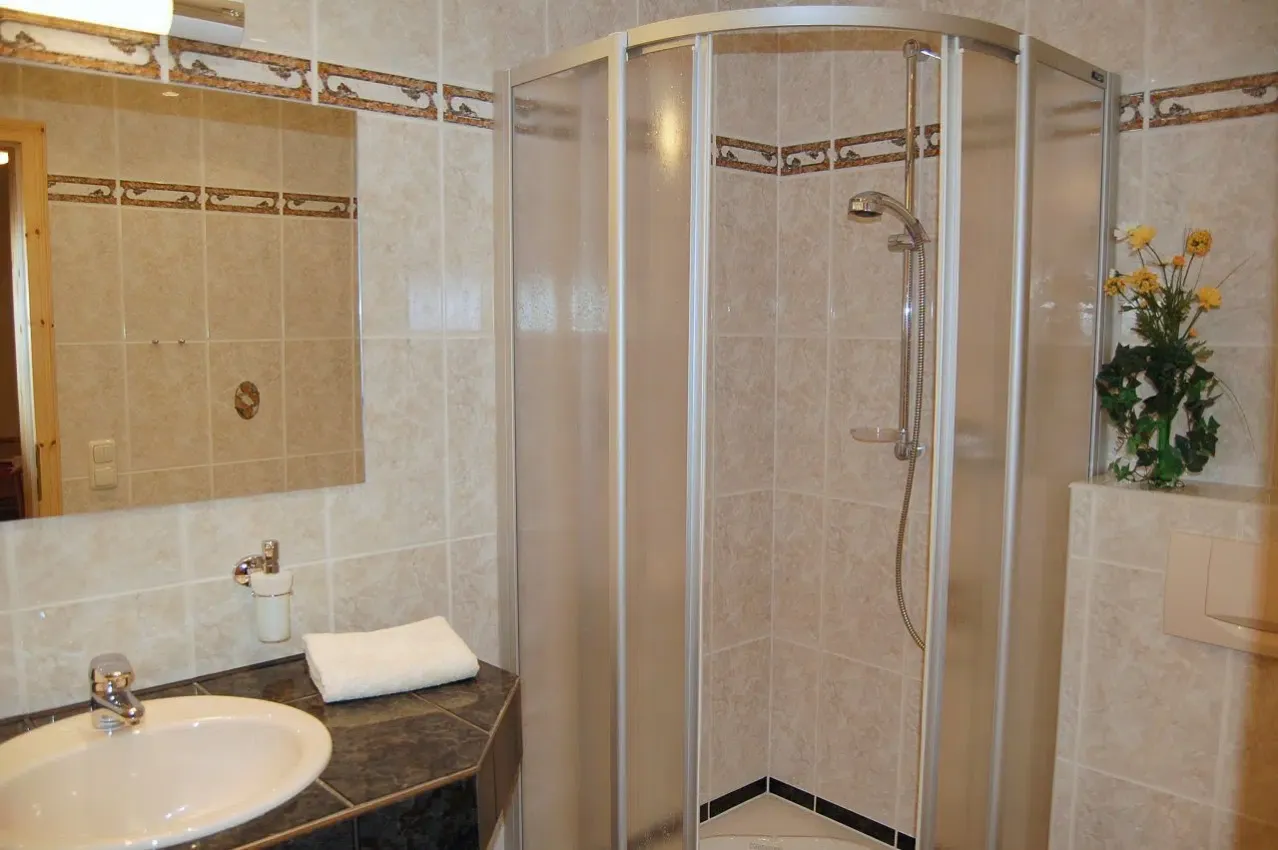 • Bad mit Viertelkreis-Dusche, WC und geräumigem Waschtisch
